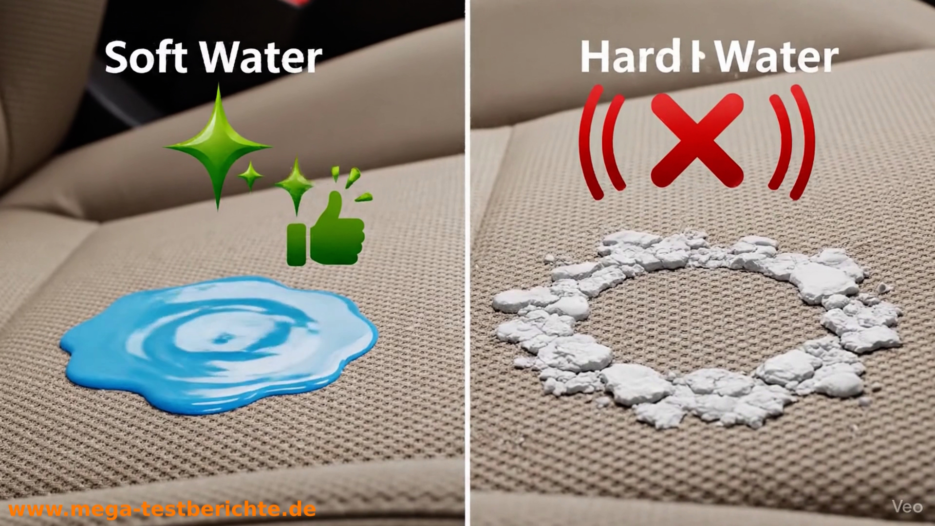 - Hartes Wasser → enthält Kalk → erzeugt beim Trocknen neue Flecken.