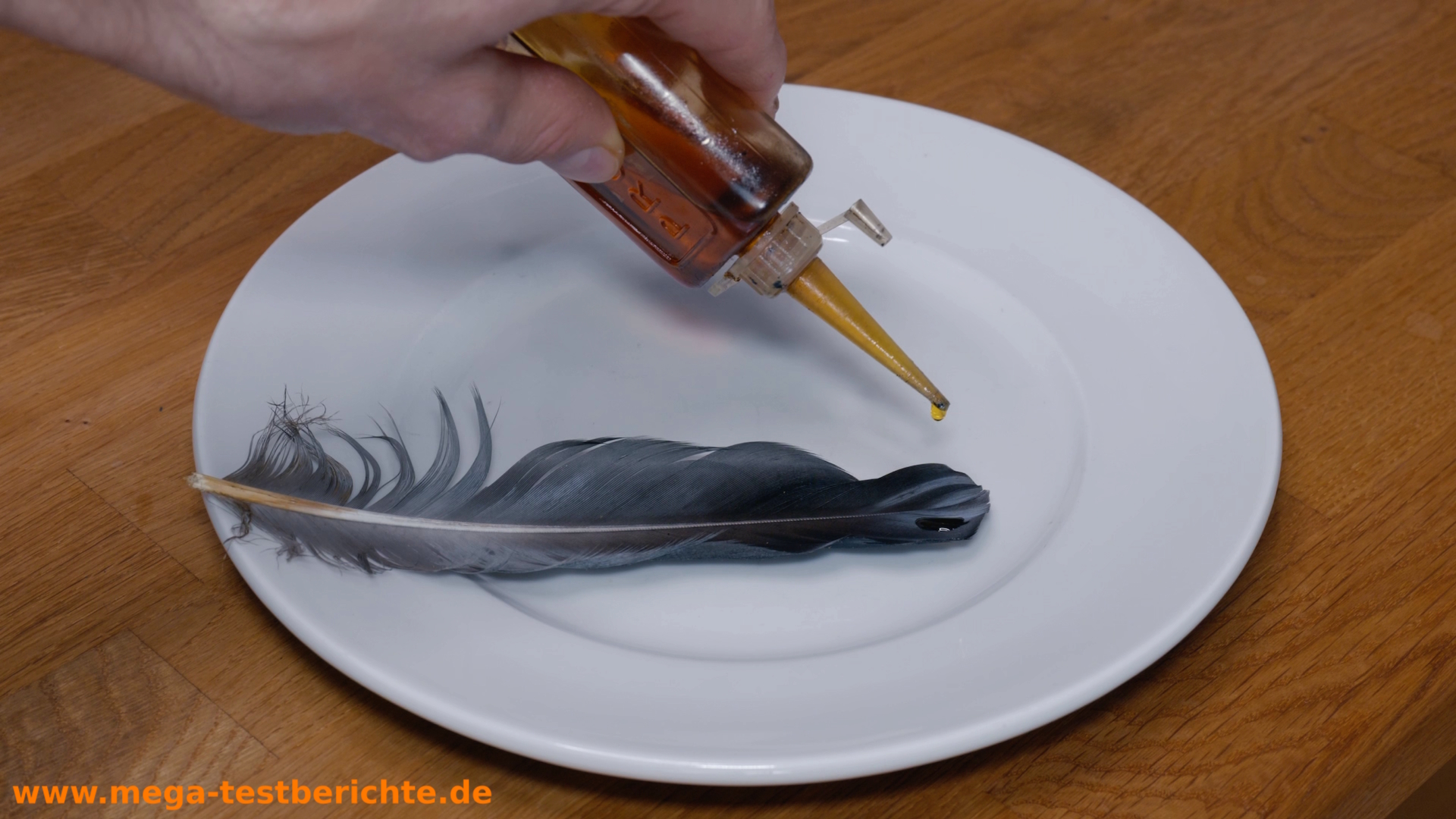 Gib zwei kleine Tropfen Öl auf die Feder und fahre damit an: