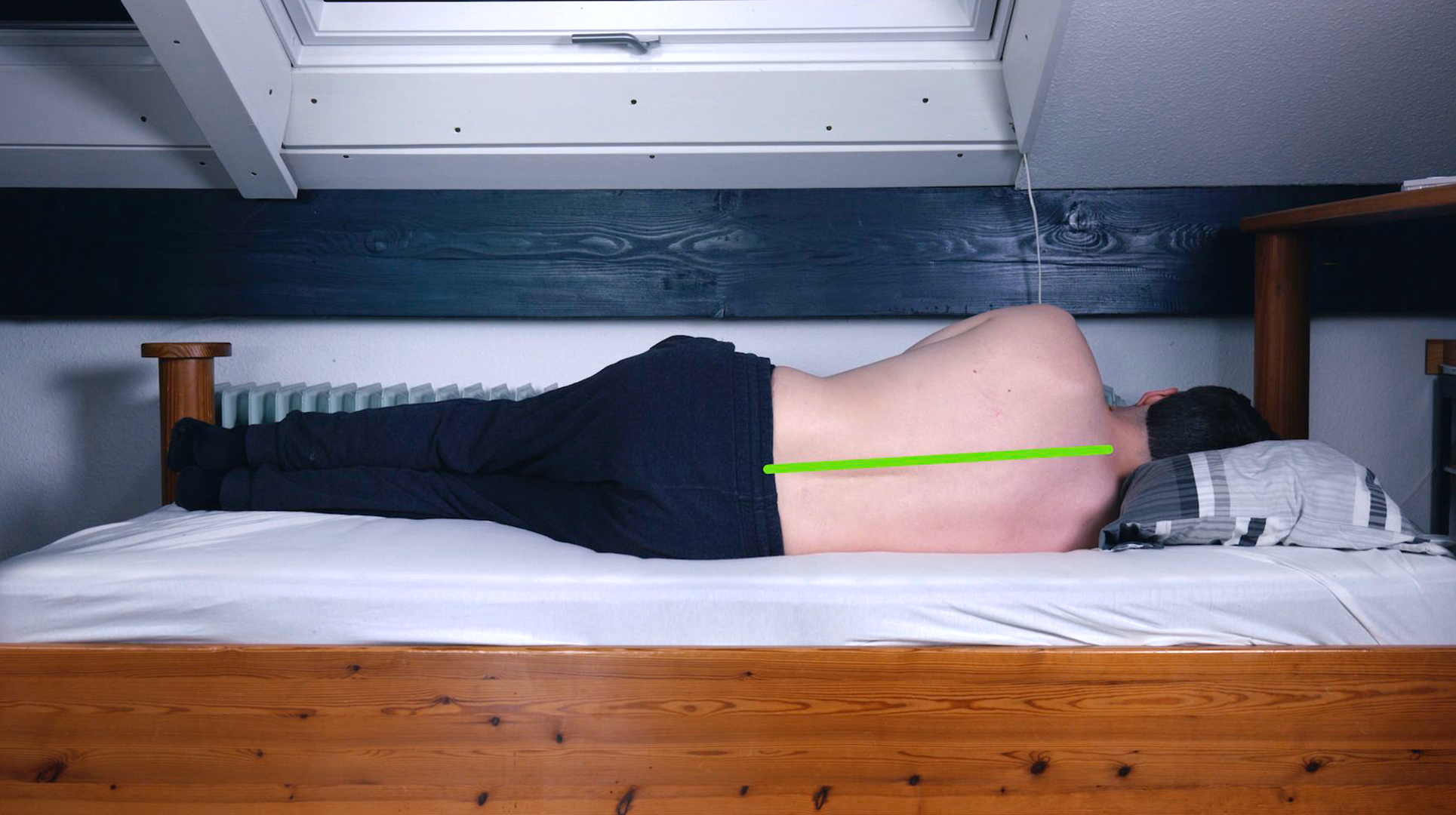 Wie du seitlich liegst, hängt immer von deiner Schulterbreite und dem Gewicht deines Oberkörpers ab. Wie ich seitlich liege, das siehst du unten im Bild. Ich sinke mit der Schulter nicht ganz so tief ein. Meine Schulterbreite beträgt auf Höhe der Schultermuskeln etwa 50 cm.