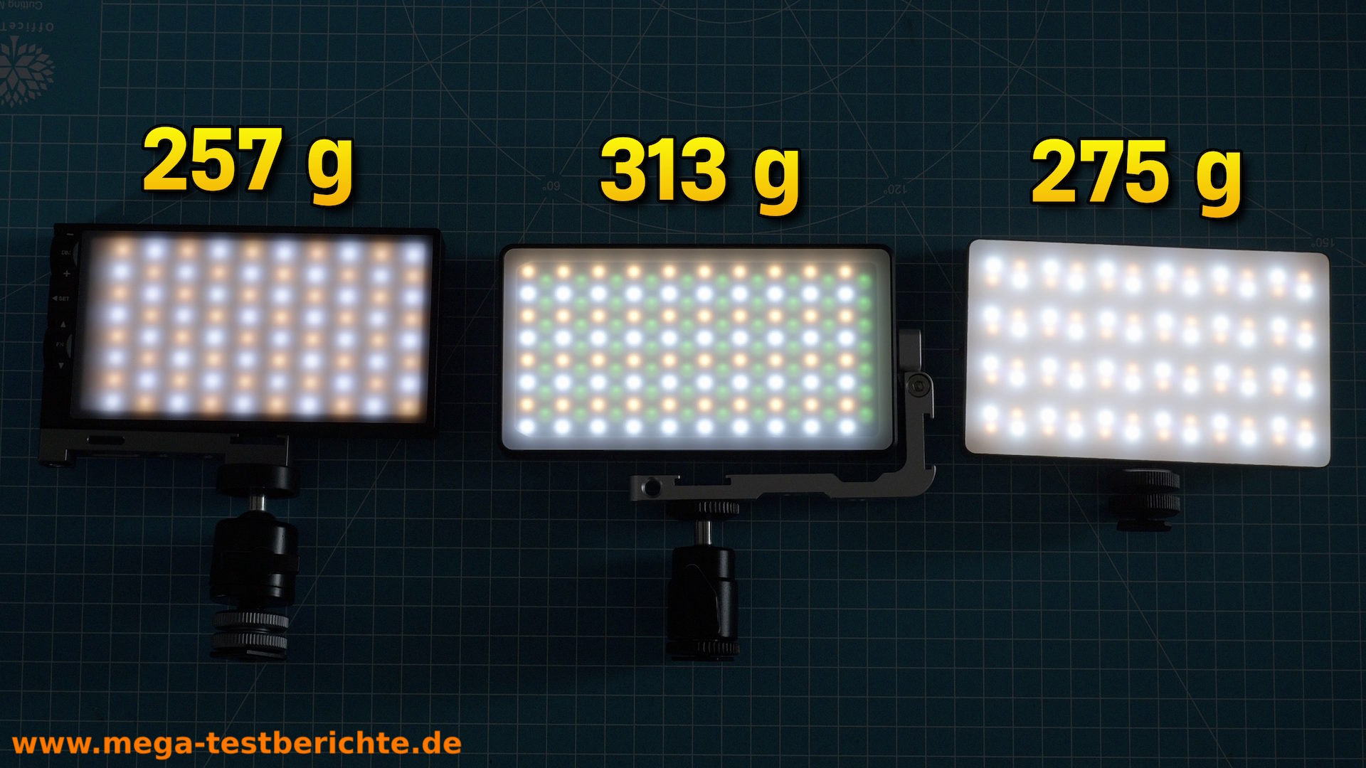 Wichtig vorab: Bei den getesteten Videoleuchten sind jeweils nur ca. die Hälfte der LEDs für den Tageslichtmodus (5200–5600K) zuständig – die andere Hälfte ist für RGB-Farben reserviert.
