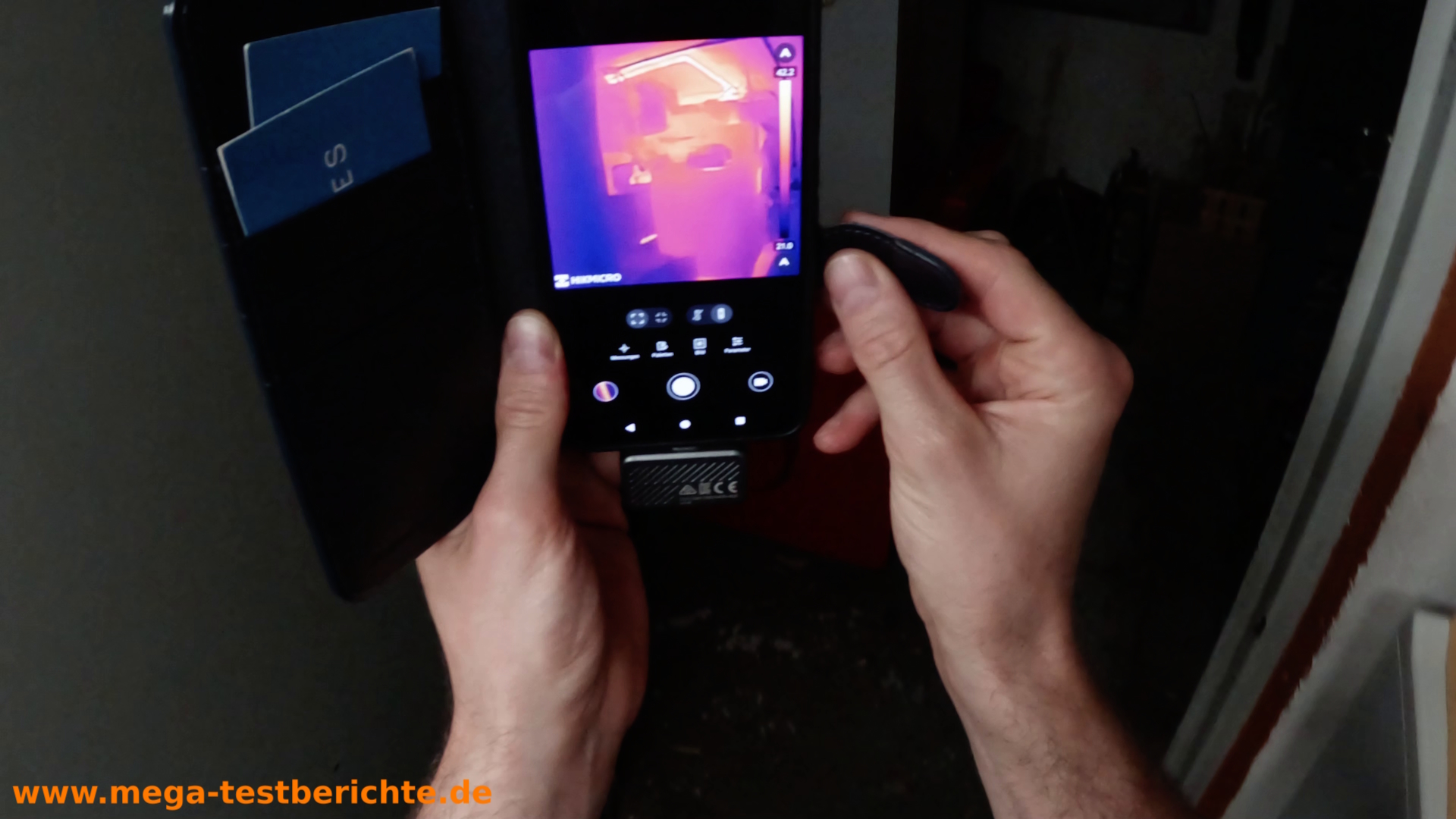 Als Nächstes habe ich die Kamera auf meine Kellertür gerichtet. Sofort war ein schmaler, gelber Spalt an der Seite zu sehen – hier geht im Winter die Wärme raus und die Kälte rein! Genau diese Wärmelecks zu finden, ist der größte Vorteil der Kamera.