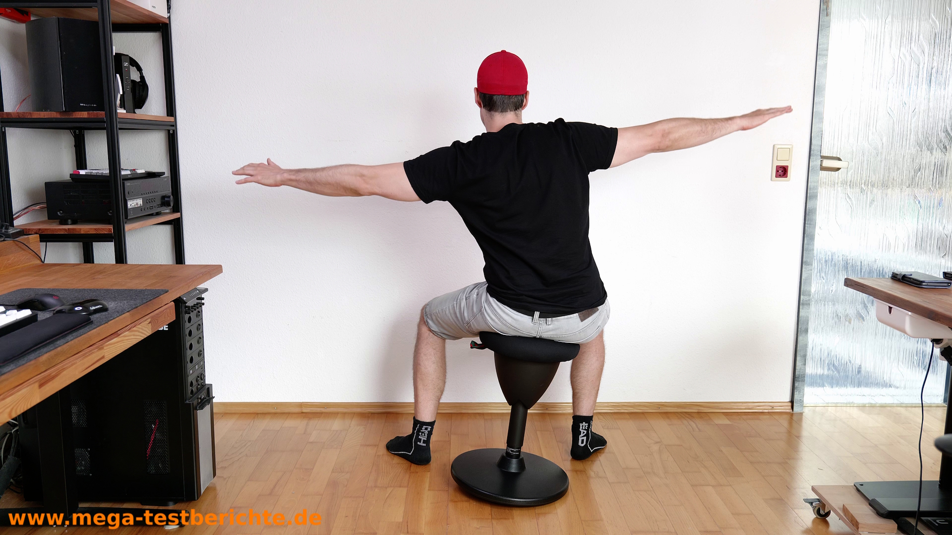 Denn: Der Hocker hat einen nach außen gewölbten Fuß, der dich zum sanften Kippeln, Kreisen und Wippen motiviert. Diese Mikrobewegungen fördern:
