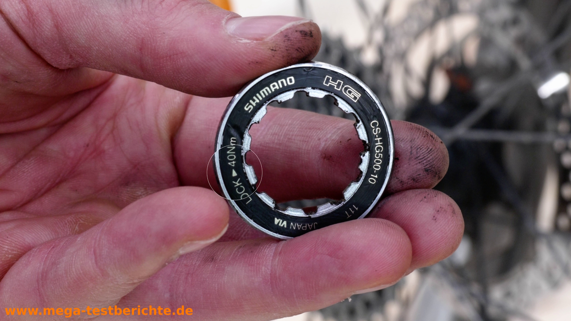 Säubere den Ring um die Kassette herum. Da steht es. Bei mir ist es eine Shimano CS-HG500 10-fach Kassette.