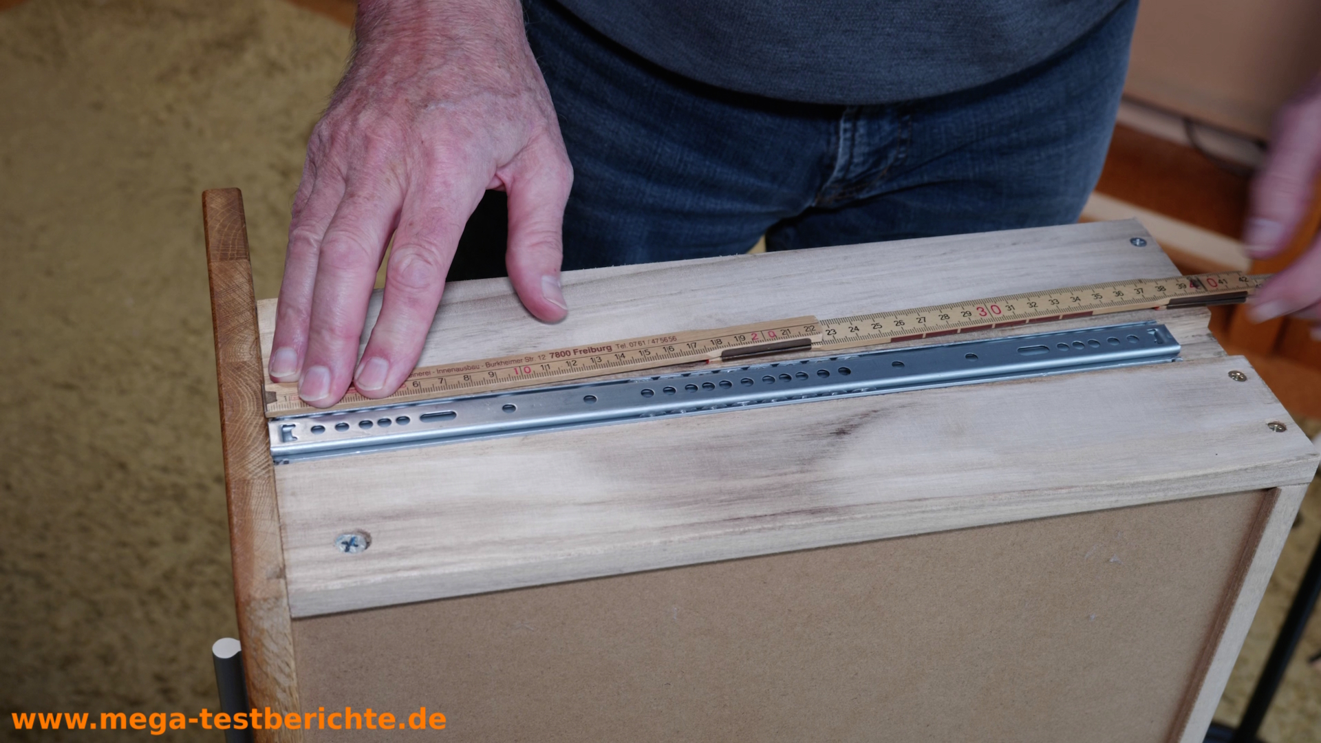 - Achte darauf, dass die Schiene ganz ausgezogen ist, bevor du sie abschraubst.“