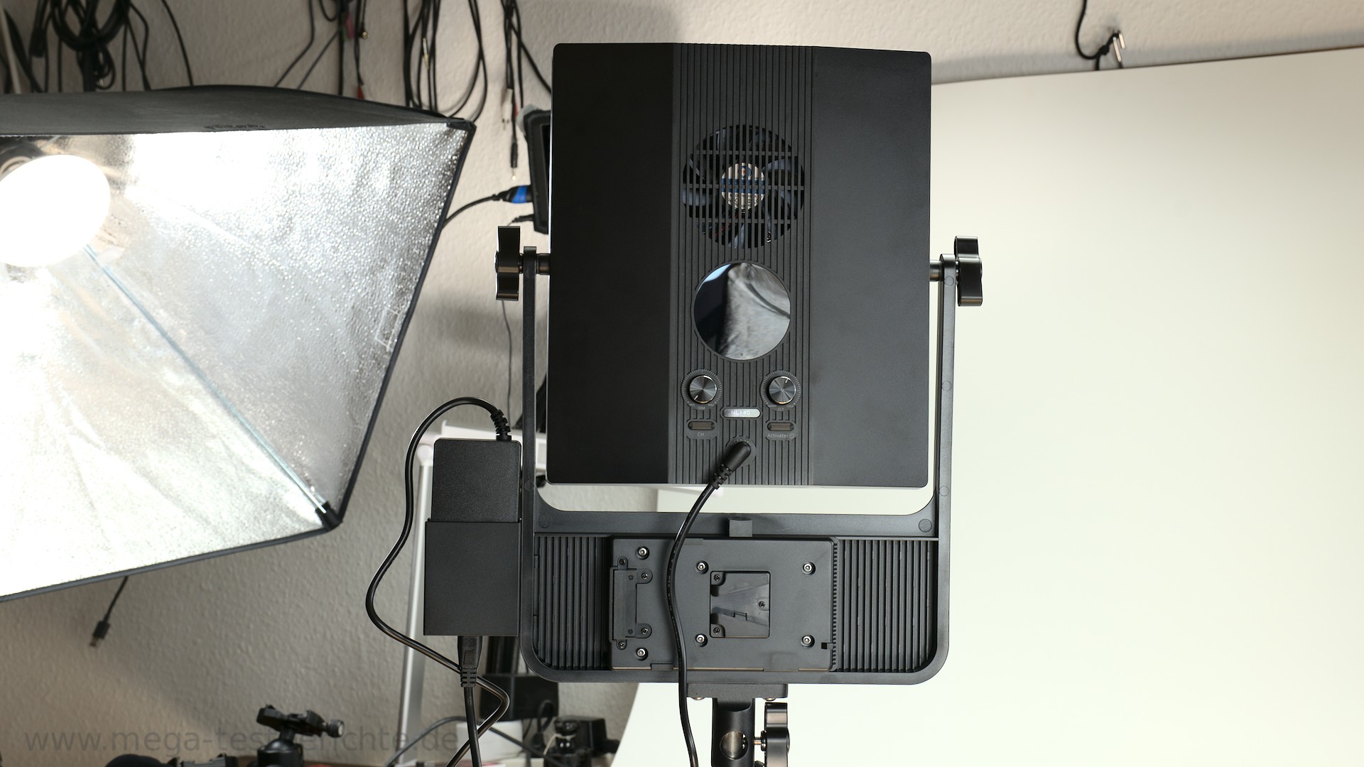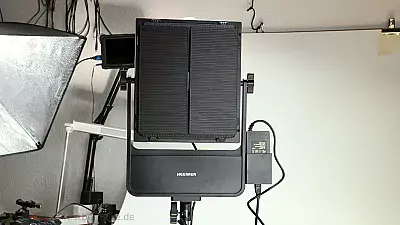 Auf der Rückseite sehen wir auch noch den Slot für einen V-Lock Akku. Wie gesagt sind diese Akkus teurer und Neewer verkauft die z.B. für um die 100€. Somit ist ein Akku teurer als der ganze Strahler.