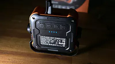 Die Powerbank-Lampe wirkt für einen Preis von 30 Euro erstmal solide. Das Gehäuse besteht aus ABS-Kunststoff, der sich solide anfühlt. Die Vorder- und Rückplatte sind verschraubt und wir sehen hier auch die Schrauben. Das zu öffnen wäre also leicht möglich. Auf der Rückseite befinden sich die vier Tasten zur Steuerung und darunter 4 LEDs die den Ladestand anzeigen. Die Steuerung erkläre ich gleich noch genauer. Die Anschlüsse befinden sich hinter einer Gummiklappe. Geladen wird per Micro-USB und der Powerbank-Anschluss ist ein normaler großer USB-Anschluss. Laut Herstellerangabe ist das Gehäuse IP65 geschützt, sprich es ist gegen Staub und Strahlwasser geschützt.